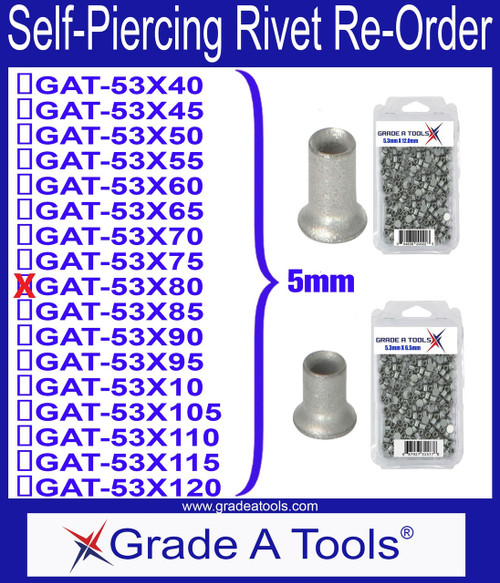 5.3mm x 8.0mm aluminum self piercing rivets deliver reliable deep penetration and high joint strength for intensive automotive collision repairs, piercing thick or multi-layer materials without pre-drilled holes to form secure, long-lasting bonds. These semi-tubular rivets are equipped with a corrosion-resistant coating to eliminate galvanic contamination risks when joining aluminum to aluminum or aluminum to steel. Each box includes 100 premium-quality rivets optimized for hydraulic or pneumatic self-piercing rivet guns. Ideal for professional body shops tackling reinforced structural panels on trucks, SUVs, and modern vehicles requiring excellent shear strength and no heat distortion.